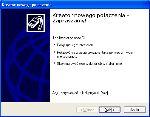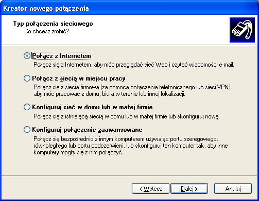 Zaznaczamy opcję Połącz z Internetem i wybieramy przycisk dalej.